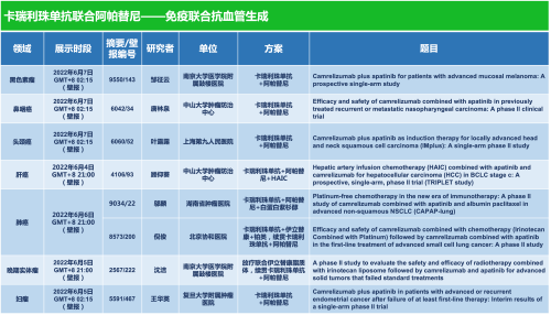 “双艾”方案单独或联合系统治疗或局部治疗在黑色素瘤、鼻咽癌、头颈肿瘤、肺癌、肝癌、胰腺癌、妇瘤等领域共有8个研究接收为壁报。