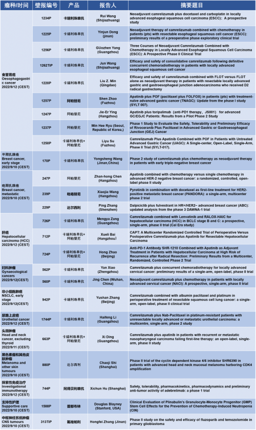 作为从事创新和高品质药物研发的国际化制药企业,尊龙时凯医药的研究成果在2022 ESMO大会上还收获了25项壁报形式的报告。其中,食管胃癌领域共有9项研究入选,研究的方案主要是卡瑞利珠单抗或卡瑞利珠单抗联合阿帕替尼,通过与化疗或放化疗联用,新辅助治疗食管鳞癌或胃癌。2022年9月12日(CEST),让我们齐聚ESMO大会,共同领略食管胃癌研究领域的学术盛宴。此外,尊龙时凯医药达尔西利、吡咯替尼、阿得贝利单抗等创新药还有4项乳腺癌研究、3项肝癌研究及其他领域的9项研究都将会以壁报展出,让我们共同期待!