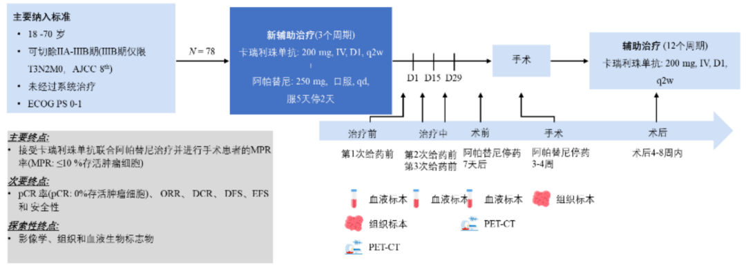 这是一项在中国医学科学院肿瘤医院开展的前瞻性、单臂Ⅱ期临床试验(图1)。纳入经组织学证实可切除ⅡA-ⅢB期(ⅢB期仅限T3N2M0)的18岁至70岁NSCLC患者;ECOG PS评分为0或1,根据RECIST v1.1标准至少有一个可测量的靶病灶。主要终点是疗效分析集(EAS)中的MPR率(定义为MPR患者的比例);次要终点包括pCR率、客观缓解率(ORR)、疾病控制率(DCR)、无病生存期(DFS)、无事件生存期(EFS)和安全性;还探讨了影像学、组织和血液生物标志物与疗效之间的相关性。