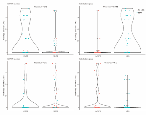 接受手术切除的患者中,与SD/PD和没有达到MPR的患者相比,影像学CR/PR(P=0.05)和达到MPR(P=0.0088)的患者在治疗前PD-L1表达水平总体上较高,而治疗后的肿瘤PD-L1表达(P > 0.05)没有显著差异。(图4)