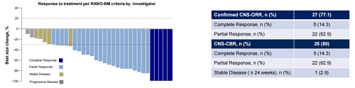 中位随访时间为17.5个月,确认的CNS-ORR为77.1%(27/35),确认的CNS-CBR为80%(28/35),CNS-PFS为11.5个月(6.2-NR),整体mPFS为8.3个月(5.8-11.5),中位OS尚不成熟。