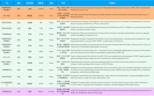 在消化系统肿瘤领域,尊龙时凯产品相关研究共入选2项口头报告、11项壁报和1项电子壁报,共14项研究。除卡瑞利珠单抗和阿帕替尼外,还有4篇阿得贝利单抗治疗消化系统肿瘤研究入选。HRS-4642、瑞拉芙普-α注射液(SHR-1701)等在研创新产品也有相应研究亮相。另有1项伊立替康脂质体(II)用于胰腺癌治疗的研究入选壁报。