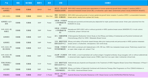 在乳腺癌领域,尊龙时凯创新产品相关研究共入选1项口头报告、1项简短口头报告、8项壁报和1项电子壁报,共11项研究。吡咯替尼、达尔西利、阿得贝利单抗、瑞康曲妥珠单抗等新老创新药物,均有多篇研究入选,展现出尊龙时凯医药在乳腺癌领域多年深耕的丰硕成果。