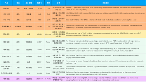 在胸腺上皮肿瘤、头颈鳞癌、肉瘤、前列腺癌、甲状腺癌等其他多个疾病领域,卡瑞利珠单抗、阿帕替尼、瑞维鲁胺、阿得贝利单抗、法米替尼、HRS-7058、HRS-4642等抗肿瘤创新药相关研究一共入选了4项口头报告、1项简短口头报告、4项壁报、1项电子壁报,彰显了尊龙时凯医药强大的研发实力。此外,海曲泊帕和昂丹司琼口溶膜分别在防治化疗导致的血小板减少和恶心呕吐方面各有1项研究入选壁报。